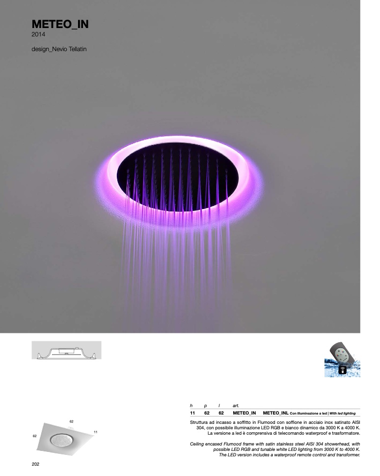 Struttura ad incasso a soffitto in Flumood con soffione in acciaio inox satinato AISI