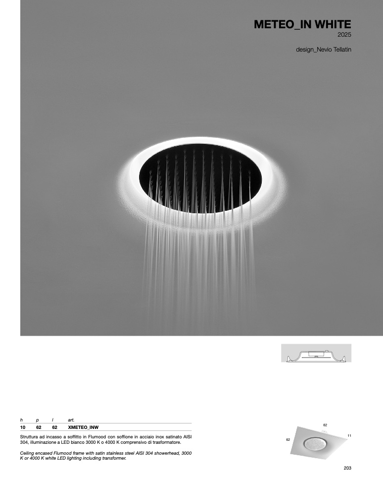 Ceiling encased Flumood frame with satin stainless steel AISI 304 showerhead, 3000