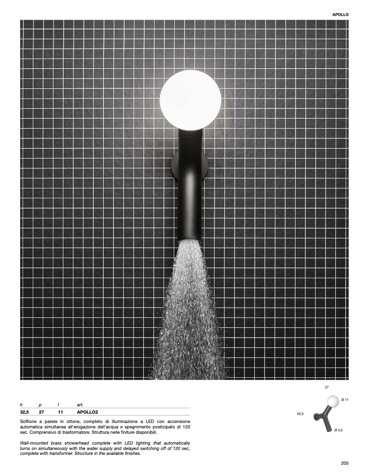 Soffione a parete in ottone, completo di illuminazione a LED con accensione