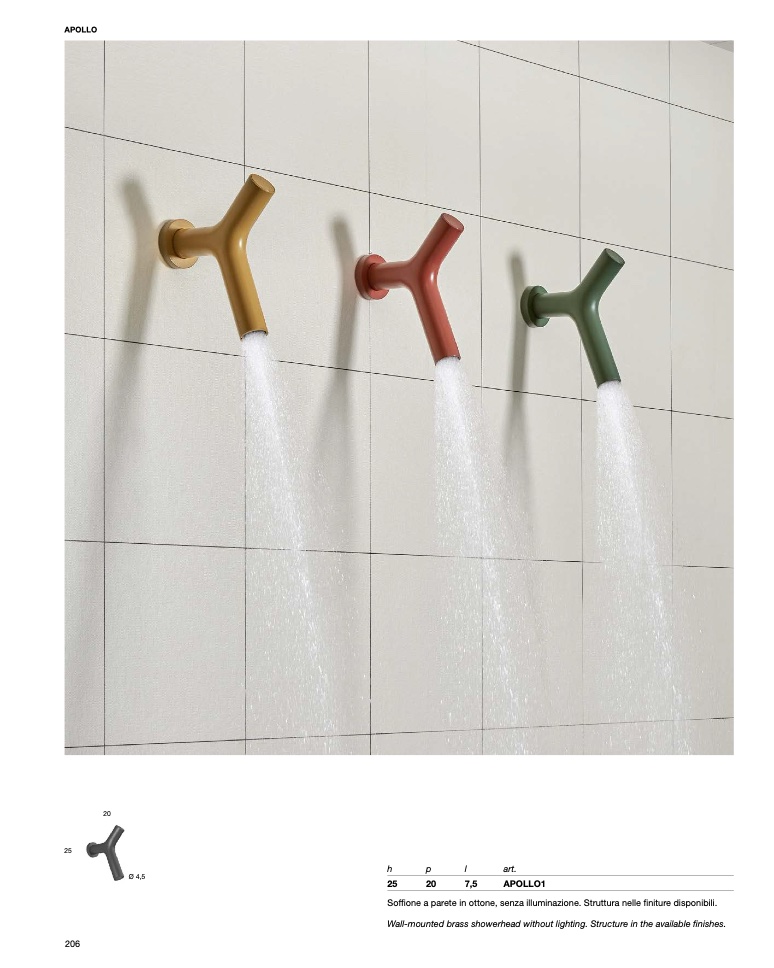 Soffione a parete in ottone, senza illuminazione. Struttura nelle finiture disponibili.