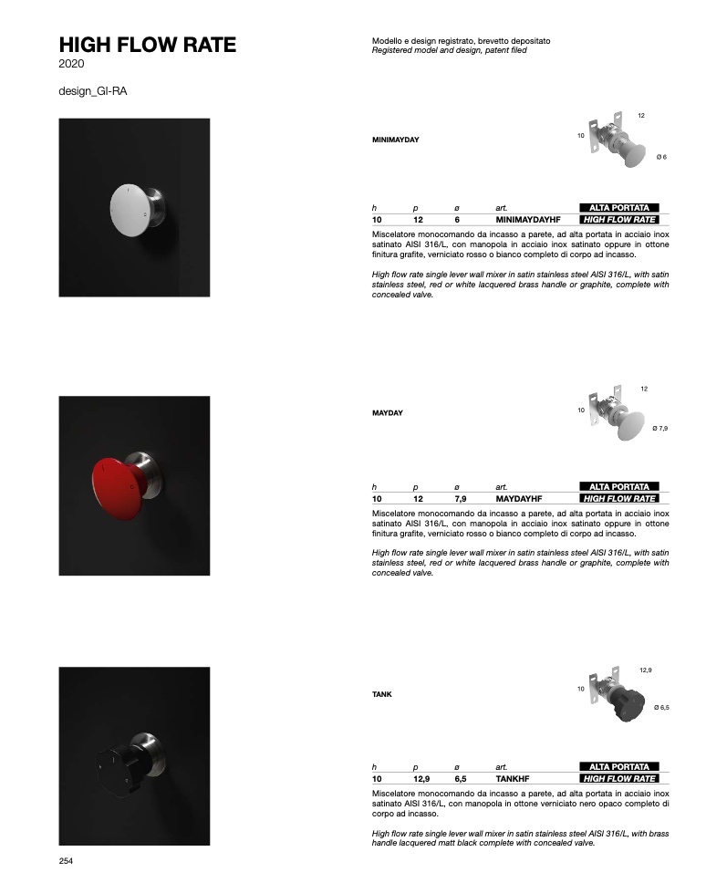 satinato AISI 316/L, con manopola in acciaio inox satinato oppure in ottone