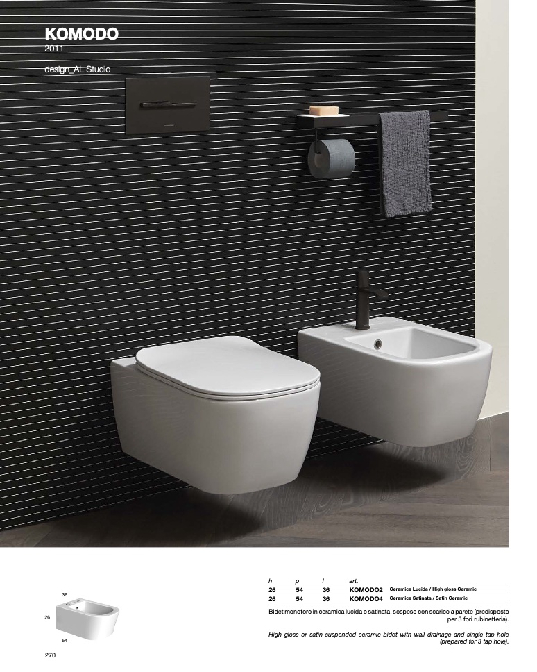 Bidet monoforo in ceramica lucida o satinata, sospeso con scarico a parete (predisposto