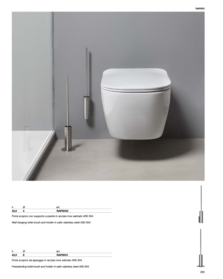 Wall hanging toilet brush and holder in satin stainless steel AISI 304.