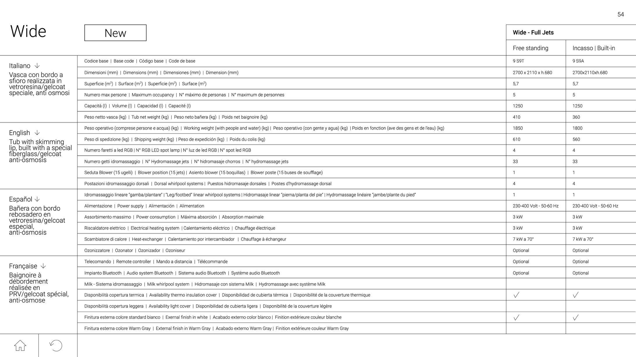 Peso netto vasca (kg) | Tub net weight (kg) | Peso neto bañera (kg) | Poids net baignoire (kg)