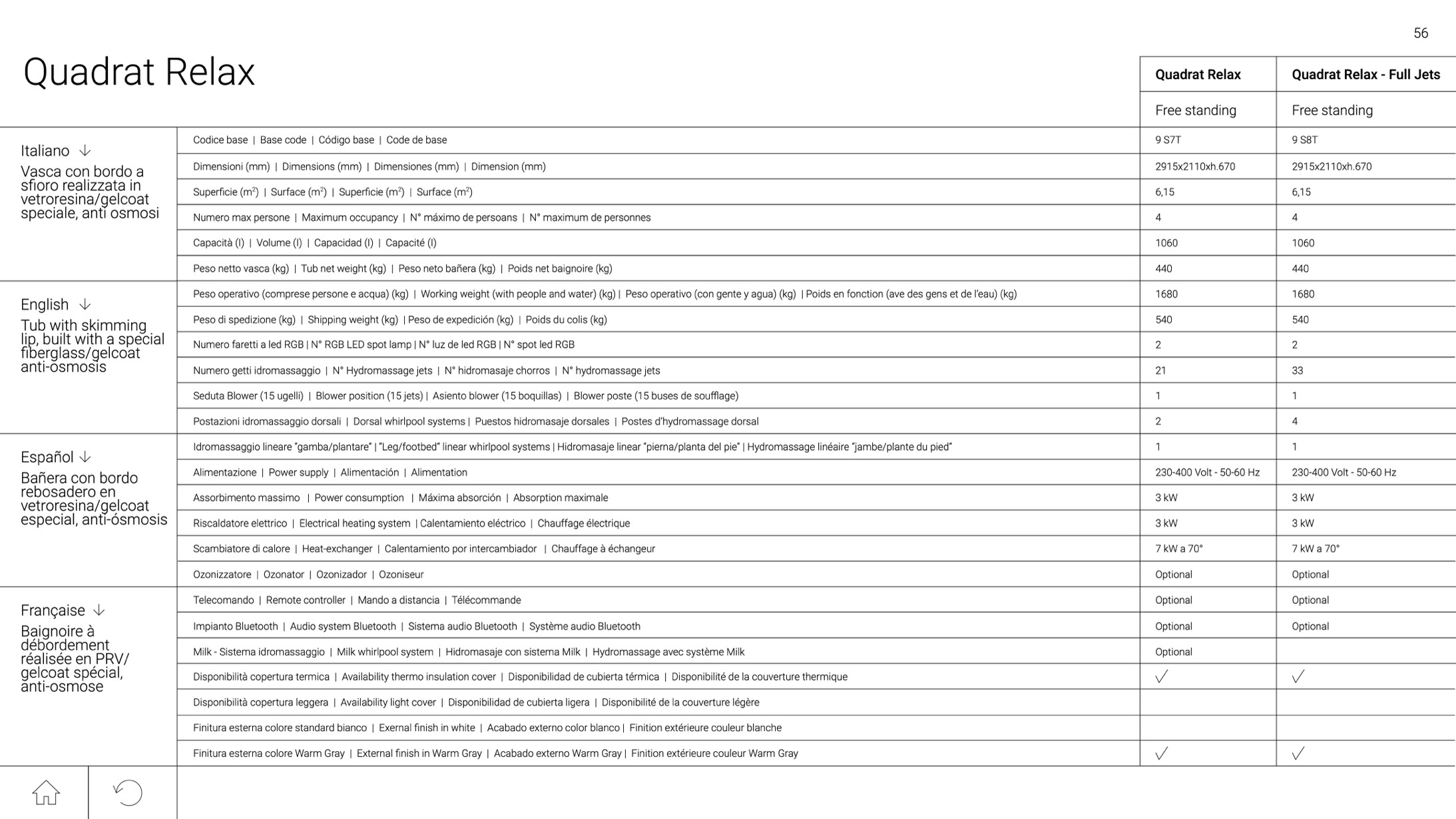 Peso netto vasca (kg) | Tub net weight (kg) | Peso neto bañera (kg) | Poids net baignoire (kg)