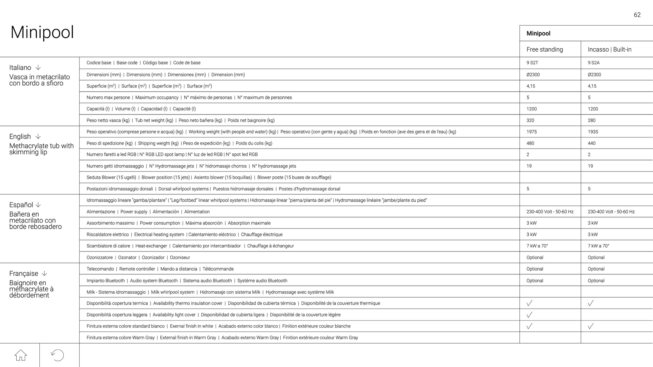 Peso netto vasca (kg) | Tub net weight (kg) | Peso neto bañera (kg) | Poids net baignoire (kg)