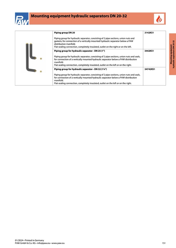 Piping group for hydraulic separator, consisting of 2 pipe sections, union nuts and seals,