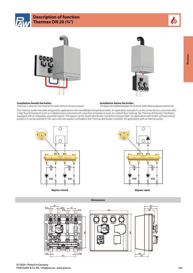 pump) or it can be opened (in this case a low-loss bypass is activated in the Thermax distribution manifold - for applications with an internal pump).