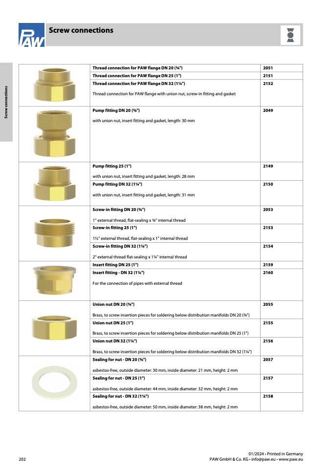 Thread connection for PAW flange with union nut, screw-in fitting and gasket