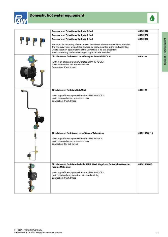 Circulation set for Friwa-Kaskade (Midi, Maxi, Mega) and for tank heat transfer