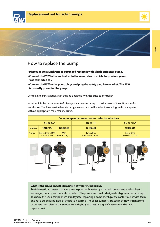 Solar pump replacement set for solar installations