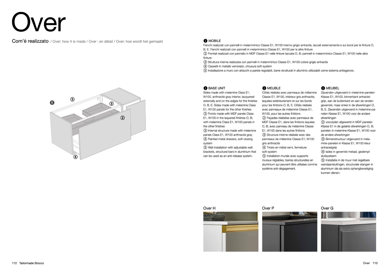 B, E. Fianchi realizzati con pannelli in melamminico Classe E1, W100 per le altre finiture