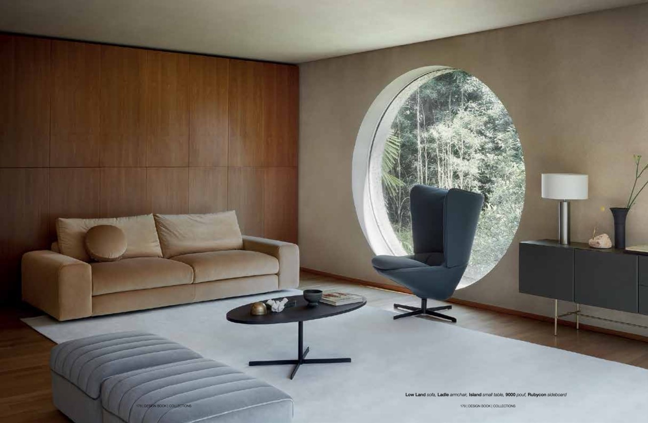 Low Land sofa, Ladle armchair, Island small table, 9000 pouf, Rubycon sideboard