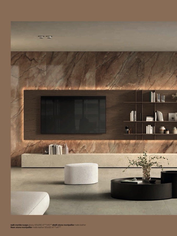 wall: marble nuage glossy 120x280 471/4"x1101/4" shelf: stone montpellier matte leathe