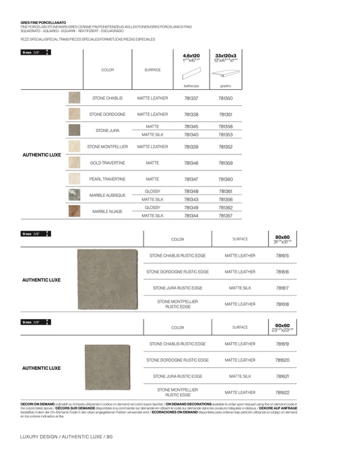 the colors listed above. / DÉCORS SUR DEMANDE disponibles à la commande sur demande en utilisant le code sur demande dans les couleurs indiquées ci-dessus. / DEKORE AUF ANFRAGE