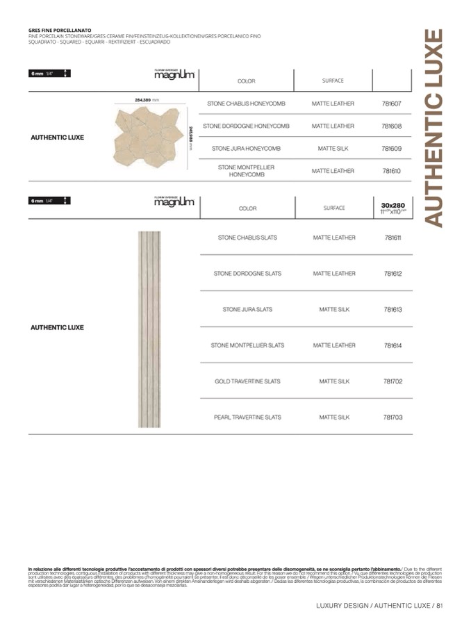 In relazione alle differenti tecnologie produttive l’accostamento di prodotti con spessori diversi potrebbe presentare delle disomogeneità, se ne sconsiglia pertanto l’abbinamento./ Due to the di