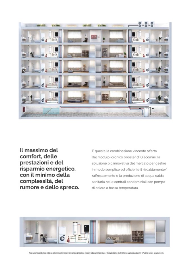 Applicazione condominiale tipica con centrale termica centralizzata con pompe di calore a bassa temperatura e moduli idronici R589HPW con scaldacqua booster HPWB nei singoli appartamenti.