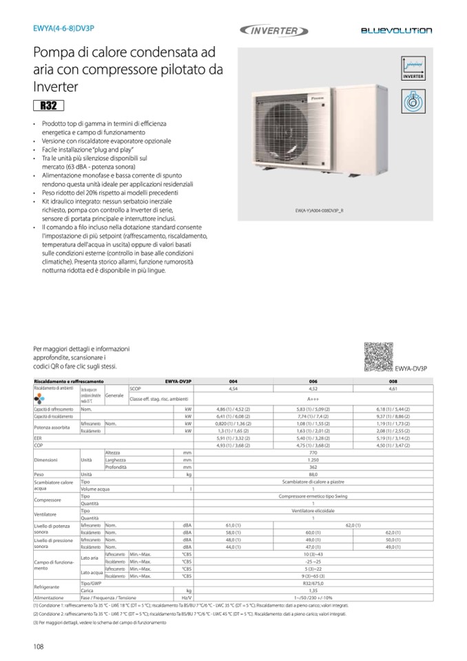 (1) Condizione 1: raffrescamento Ta 35 °C - LWE 18 °C (DT = 5 °C); riscaldamento Ta BS/BU 7 °C/6 °C - LWC 35 °C (DT = 5 °C). Riscaldamento: dati a pieno carico; valori integrati.