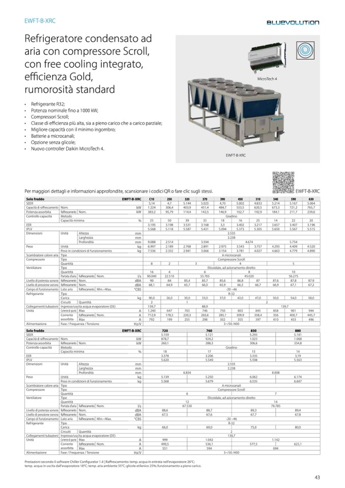 Prestazioni secondo il software Chiller Configurator 1.4 | Raffrescamento: temp. acqua in entrata nell'evaporatore 26°C;