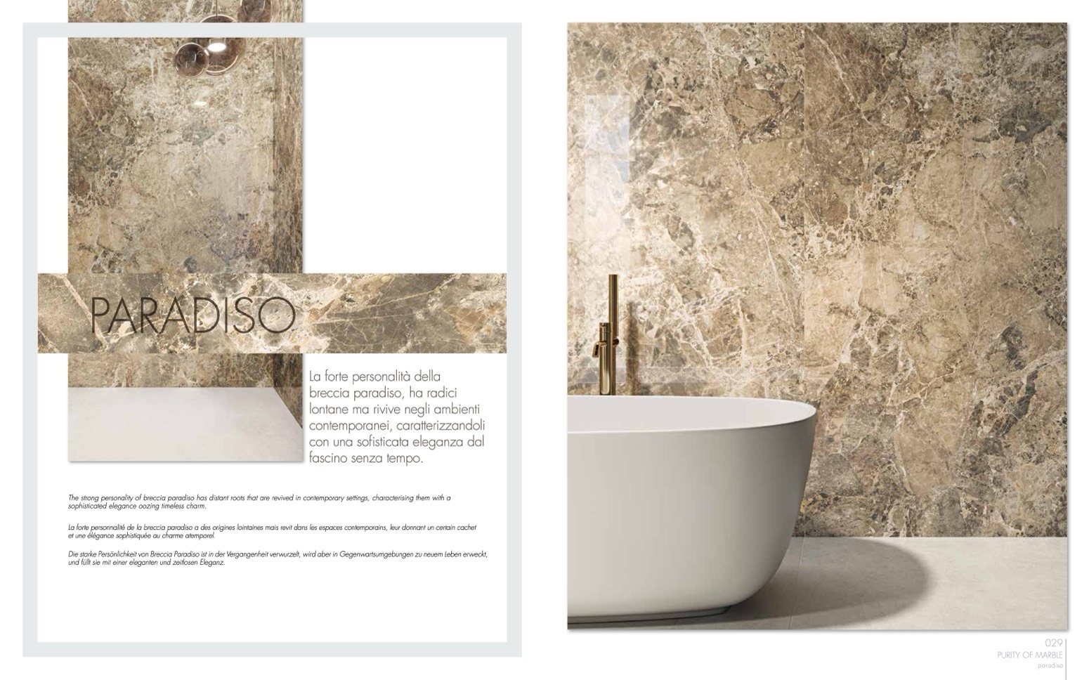 The strong personality of breccia paradiso has distant roots that are revived in contemporary settings, characterising them with a