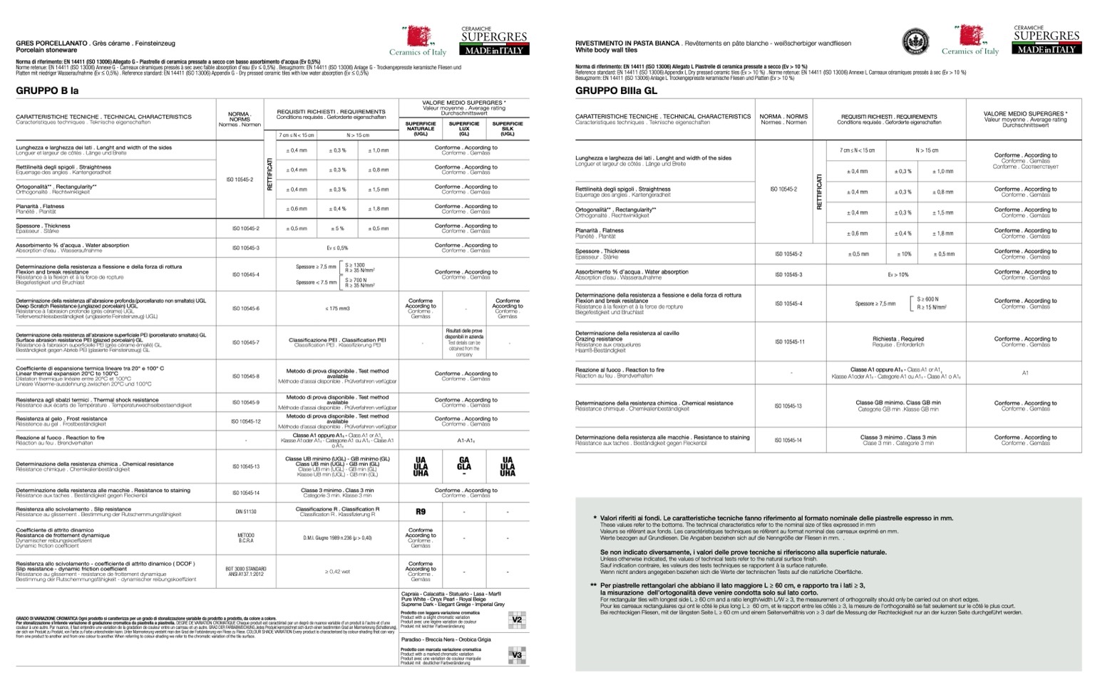 Norma di riferimento: EN 14411 (ISO 13006) Allegato G - Piastrelle di ceramica pressate a secco con basso assorbimento d’acqua (Ev 0,5%)