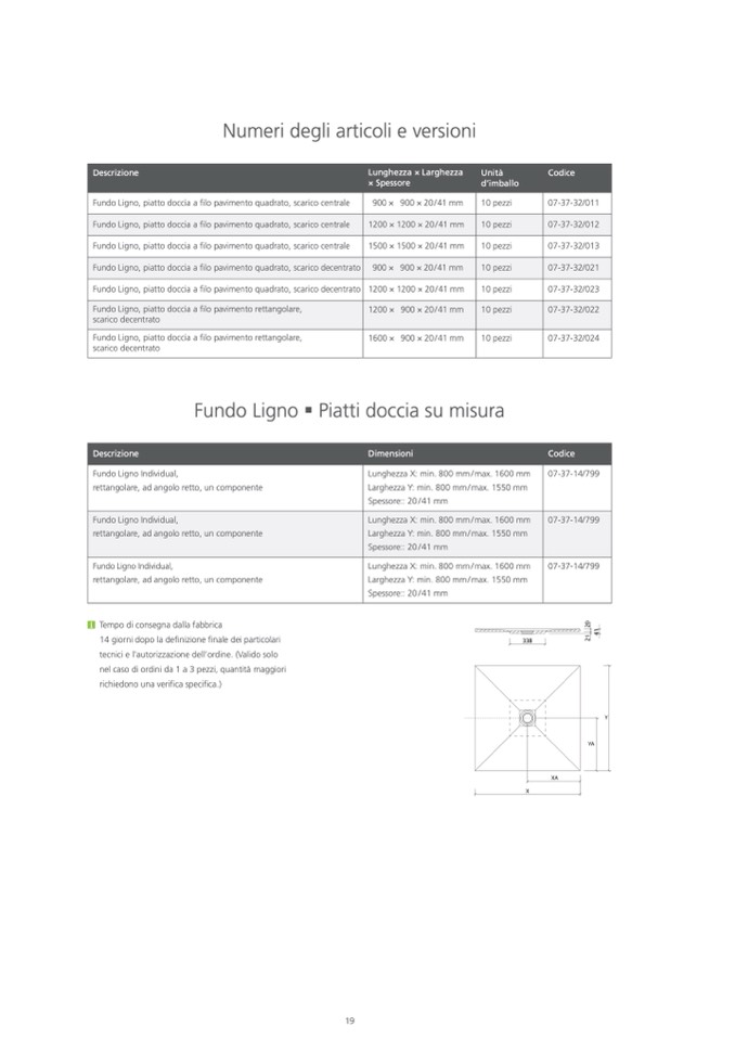 Fundo Ligno, piatto doccia a filo pavimento quadrato, scarico decentrato