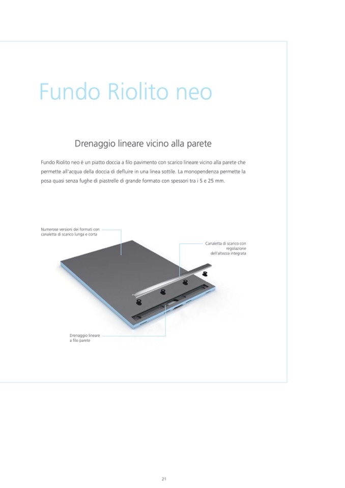 Fundo Riolito neo è un piatto doccia a filo pavimento con scarico lineare vicino alla parete che