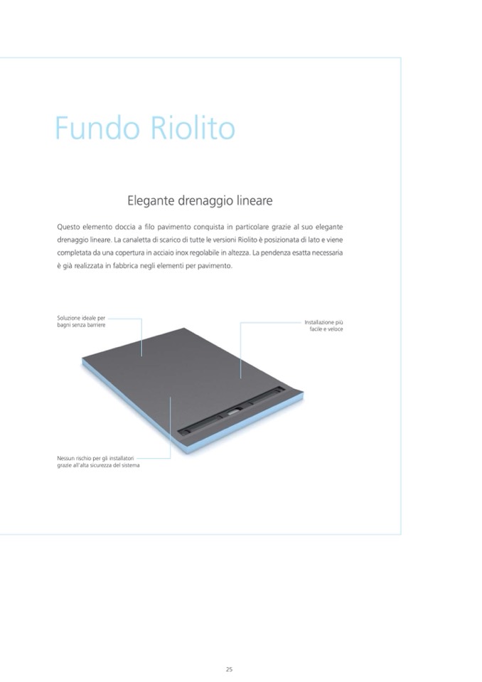 drenaggio lineare. La canaletta di scarico di tutte le versioni Riolito è posizionata di lato e viene