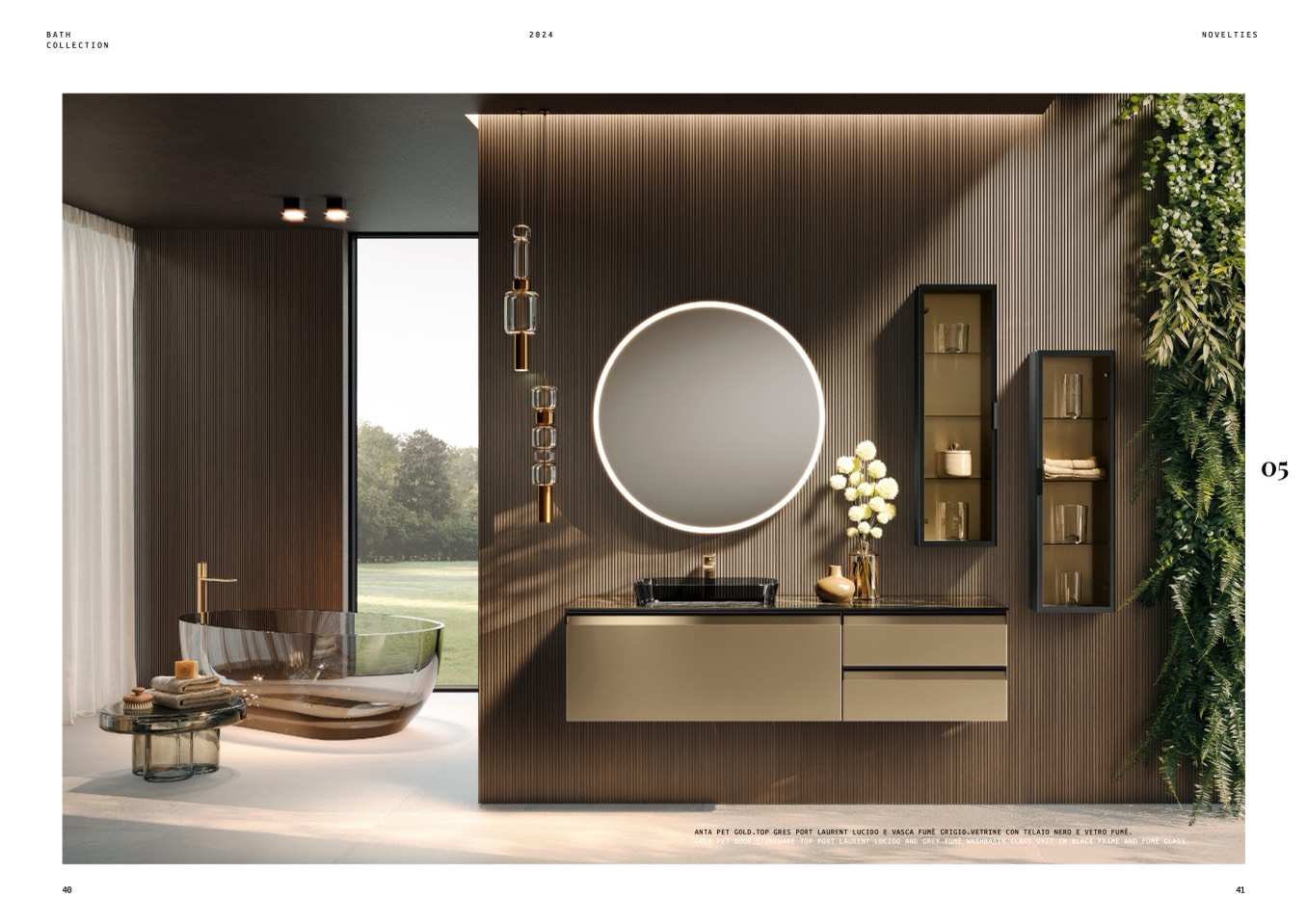 ANTA PET GOLD.TOP GRES PORT LAURENT LUCIDO E VASCA FUMÈ GRIGIO.VETRINE CON TELAIO NERO E VETRO FUMÈ.