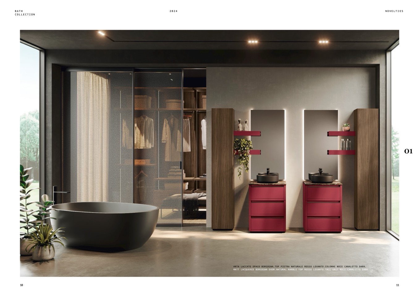 MATT LACQUERED BORGOGNA DOOR.NATURAL MARBLE TOP ROSSO LEVANTO.TALL UNIT NOCE CANALETTO DARK.