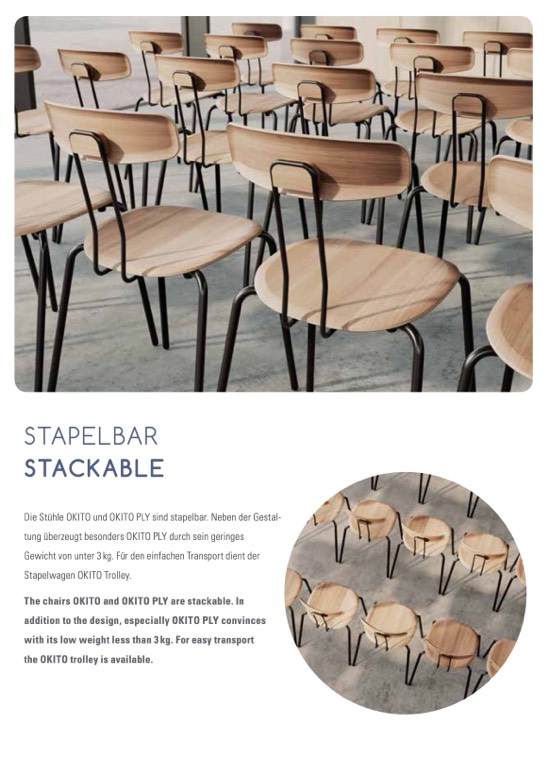 The chairs OKITO and OKITO PLY are stackable. In