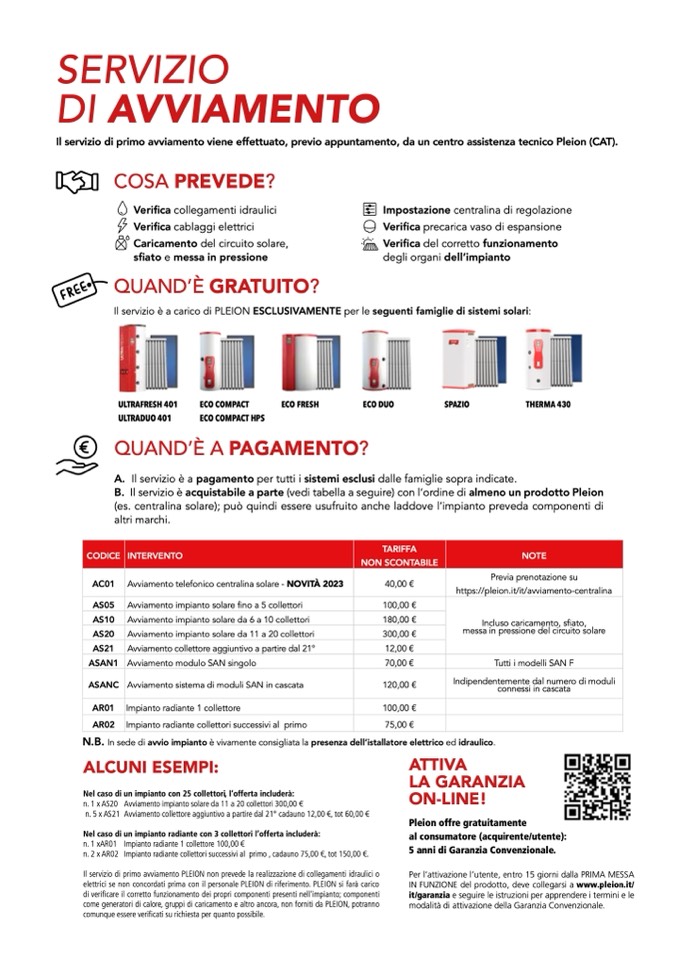 Il servizio di primo avviamento PLEION non prevede la realizzazione di collegamenti idraulici o