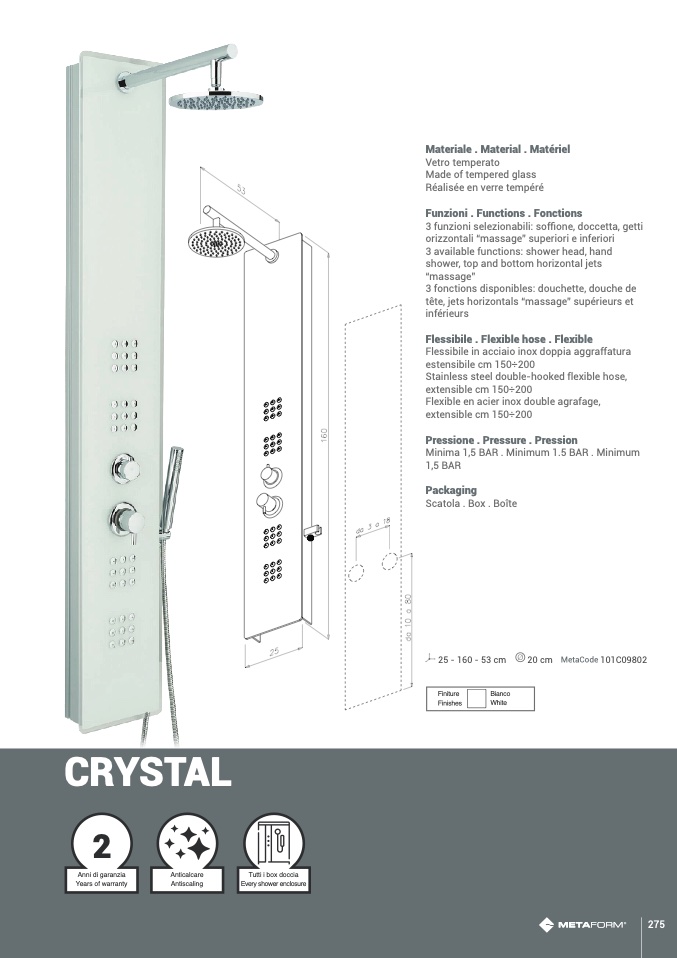 3 funzioni selezionabili: soffione, doccetta, getti