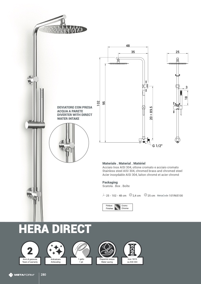 Stainless steel AISI 304, chromed brass and chromed steel