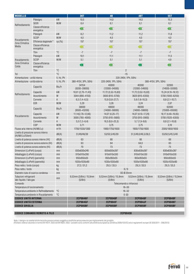 (*) Valori ottenuti secondo le norme EN 14511: 2022 ed EN14825: 2022. I prodotti sono conformi alla direttiva europea Erp (Direttiva 2009/125/EC) ed ai regolamenti europei UE 626/2011 - 206/2012)