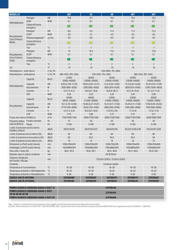 (*) Valori ottenuti secondo le norme EN 14511: 2022 ed EN14825: 2022. I prodotti sono conformi alla direttiva europea Erp (Direttiva 2009/125/EC) ed ai regolamenti europei UE 626/2011 - 206/2012)