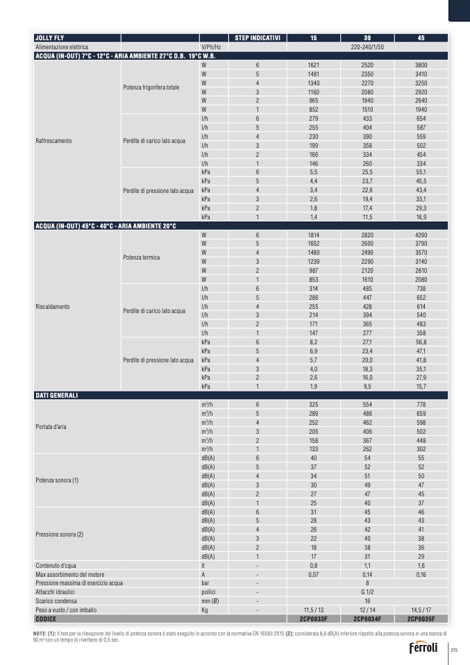 NOTE: (1): Il test per la rilevazione del livello di potenza sonora è stato eseguito in accordo con la normativa EN 16583:2015 (2): considerata 8,6 dB(A) inferiore rispetto alla potenza sonora in una stanza di