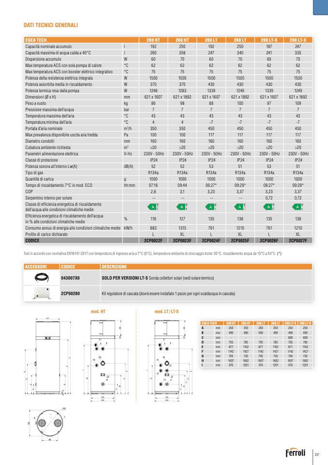 normativa EN16147-2017 con temperatura di ingresso aria a 7°C (6°C), temperatura ambiente di stoccaggio boiler 20°C, riscaldamento acqua da 10°C a 53°C. (*