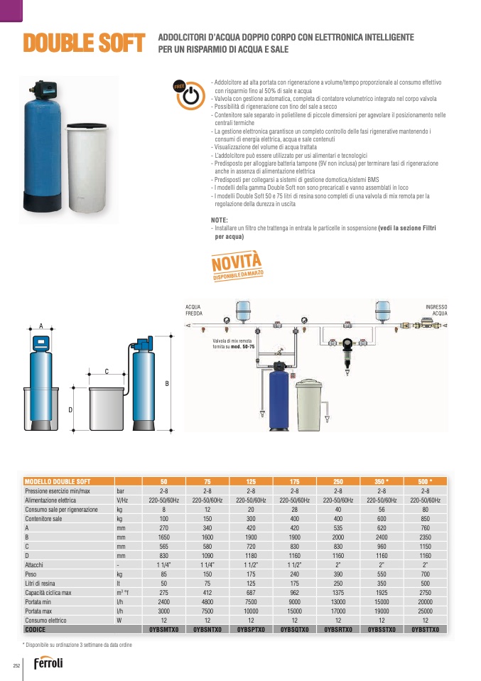 - I modelli Double Soft 50 e 75 litri di resina sono completi di una valvola di mix remota per la