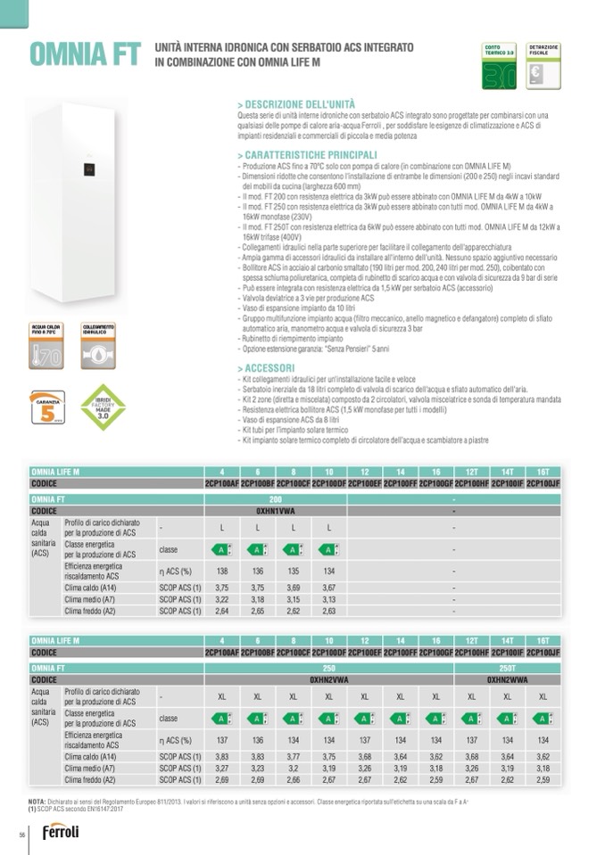 - Il mod. FT 250T con resistenza elettrica da 6kW può essere abbinato con tutti mod. OMNIA LIFE M da 12kW a