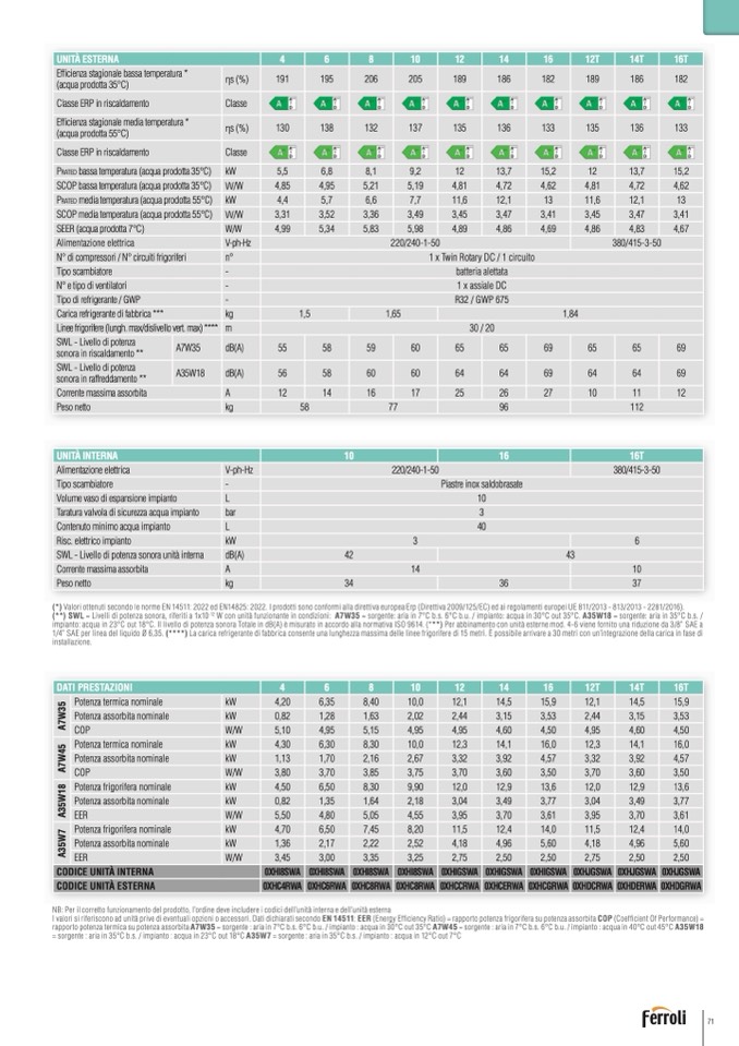 = sorgente : aria in 35°C b.s. / impianto : acqua in 23°C out 18°C A35W7 = sorgente : aria in 35°C b.s. / impianto : acqua in 12°C out 7°C