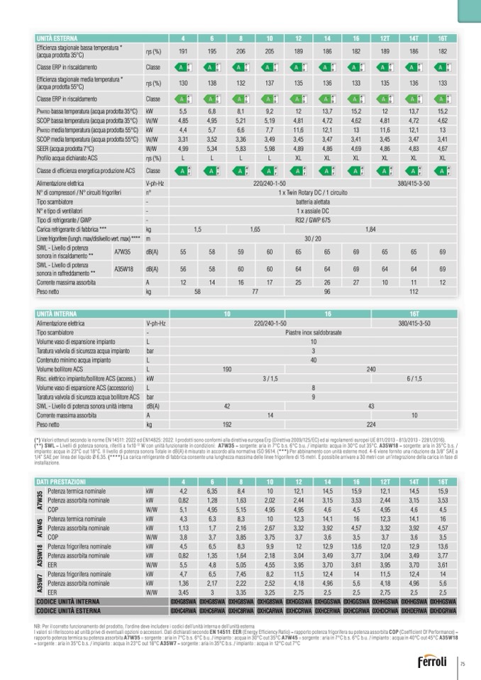 = sorgente : aria in 35°C b.s. / impianto : acqua in 23°C out 18°C A35W7 = sorgente : aria in 35°C b.s. / impianto : acqua in 12°C out 7°C