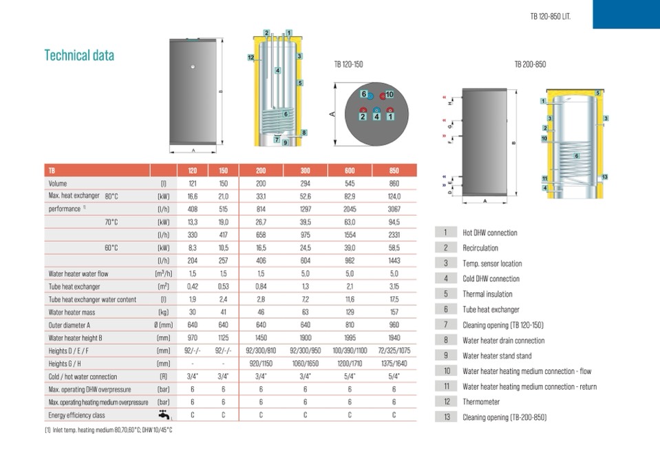 (1) Inlet temp. heating medium 80,70,60°C; DHW 10/45°C