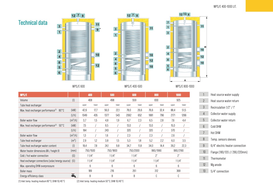 (1) Inlet temp. heating medium 80°C; DHW 10/45°C