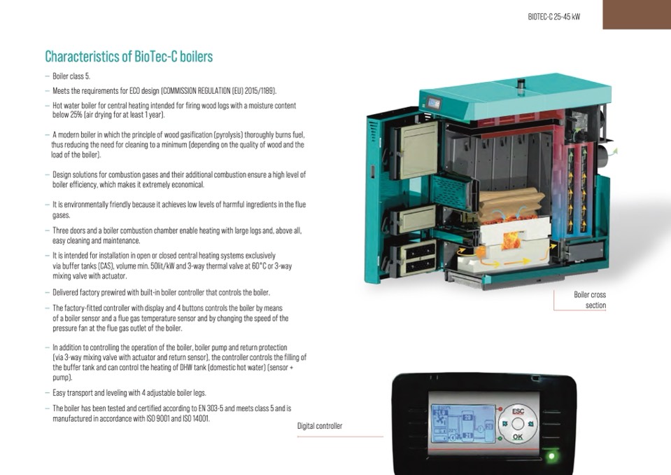— A modern boiler in which the principle of wood gasification (pyrolysis) thoroughly burns fuel,