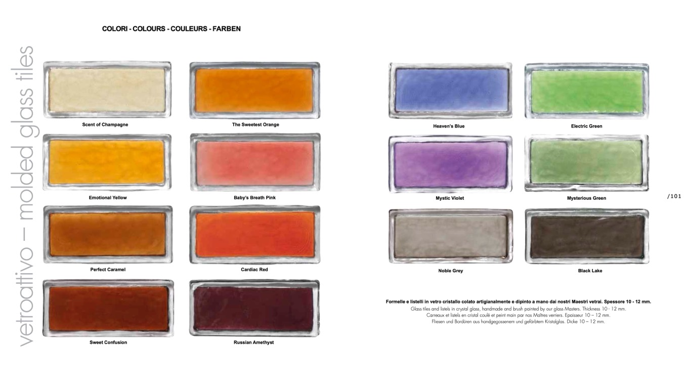 Fliesen und Bordüren aus handgegossenem und gefärbtem Kristalglas. Dicke 10 – 12 mm.