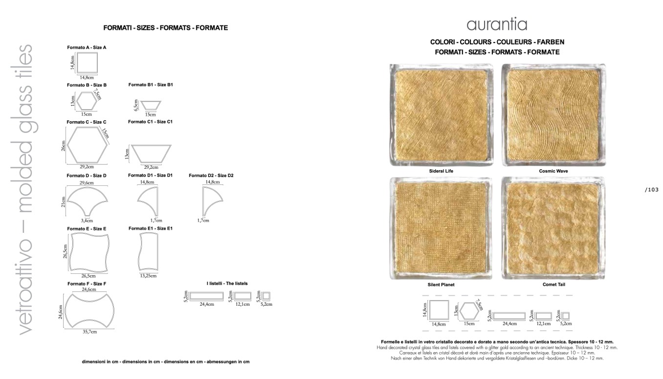 Carreaux et listels en cristal décoré et doré main d’après une ancienne technique. Epaisseur 10 – 12 mm.