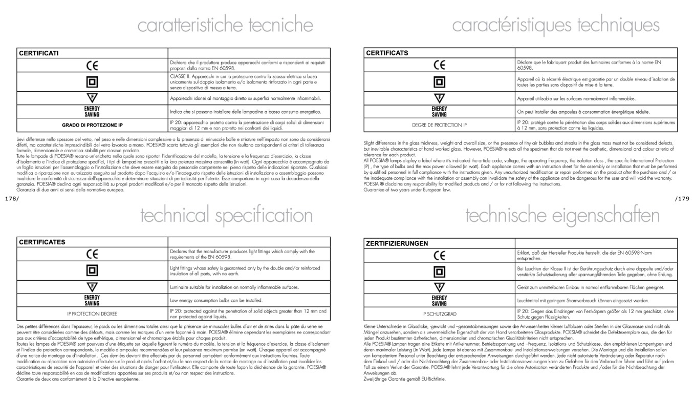 Tutte le lampade di POESIA® recano un’etichetta nella quale sono riportati l’identificazione del modello, la tensione e la frequenza d’esercizio, la classe