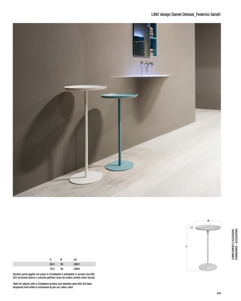 Tavolino porta oggetti con piano in Cristalplant e piedistallo in acciaio inox AISI