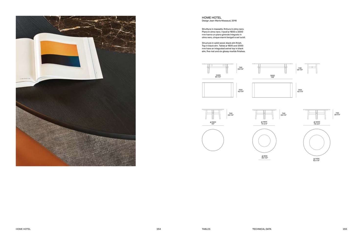 Top in black elm. Tables ø 1800 and 2000